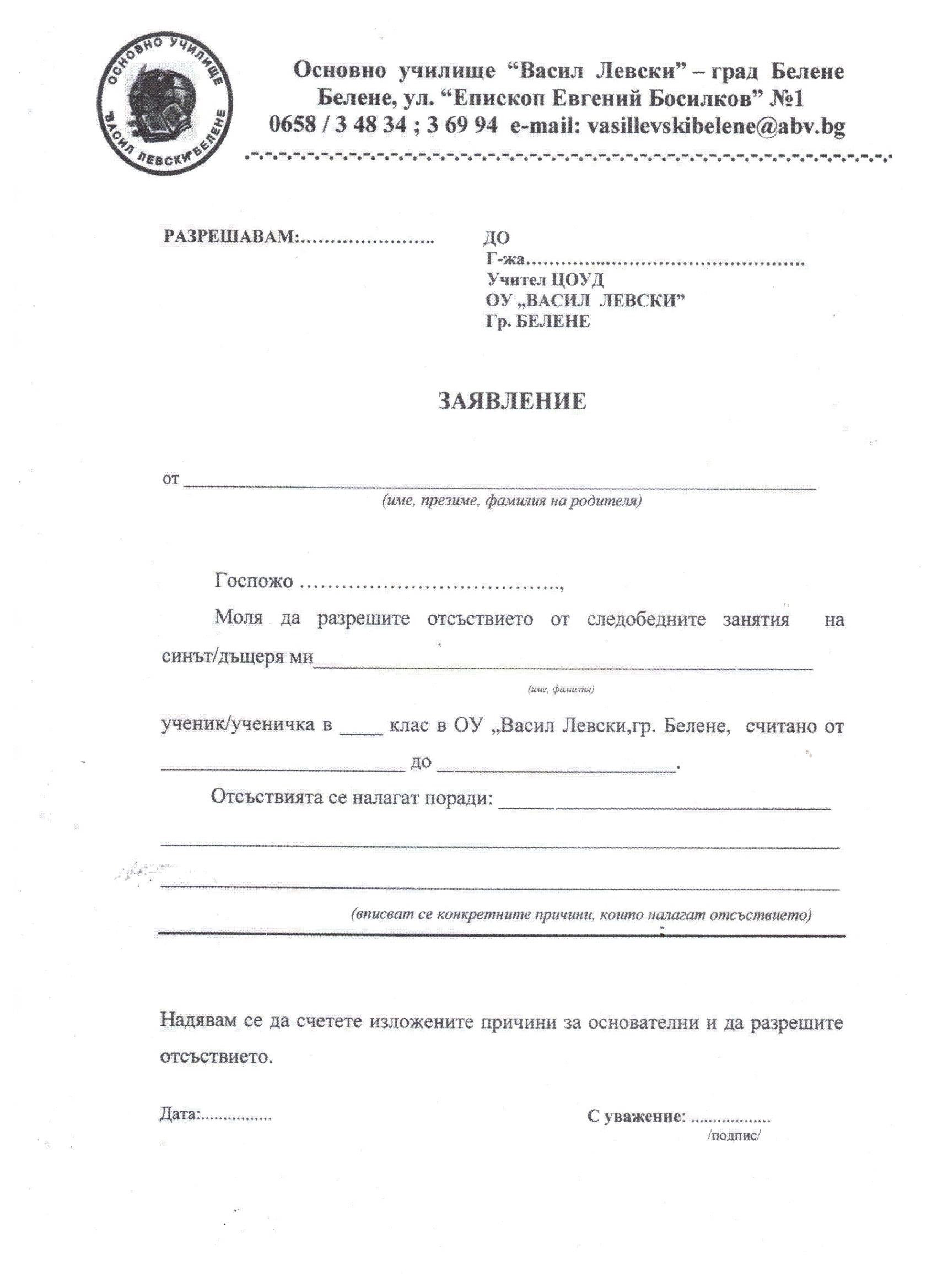 Заявление за освобождаване от учебни занятия