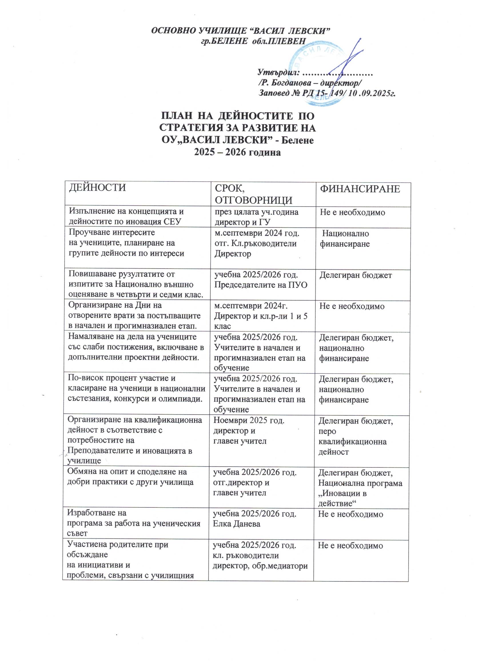 ПЛАН НА ДЕЙНОСТИТЕ ПО СТРАТЕГИЯ ЗА РАЗВИИЕ НА ОУ „ВАСИЛ ЛЕВСКИ“