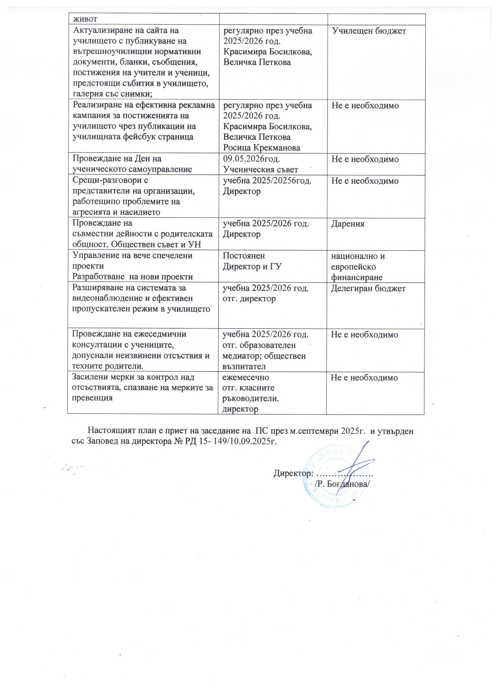 ГОДЕШЕН ПЛАН ЗА ДЕЙНАСТТА НА УЧИЛИЩЕТО