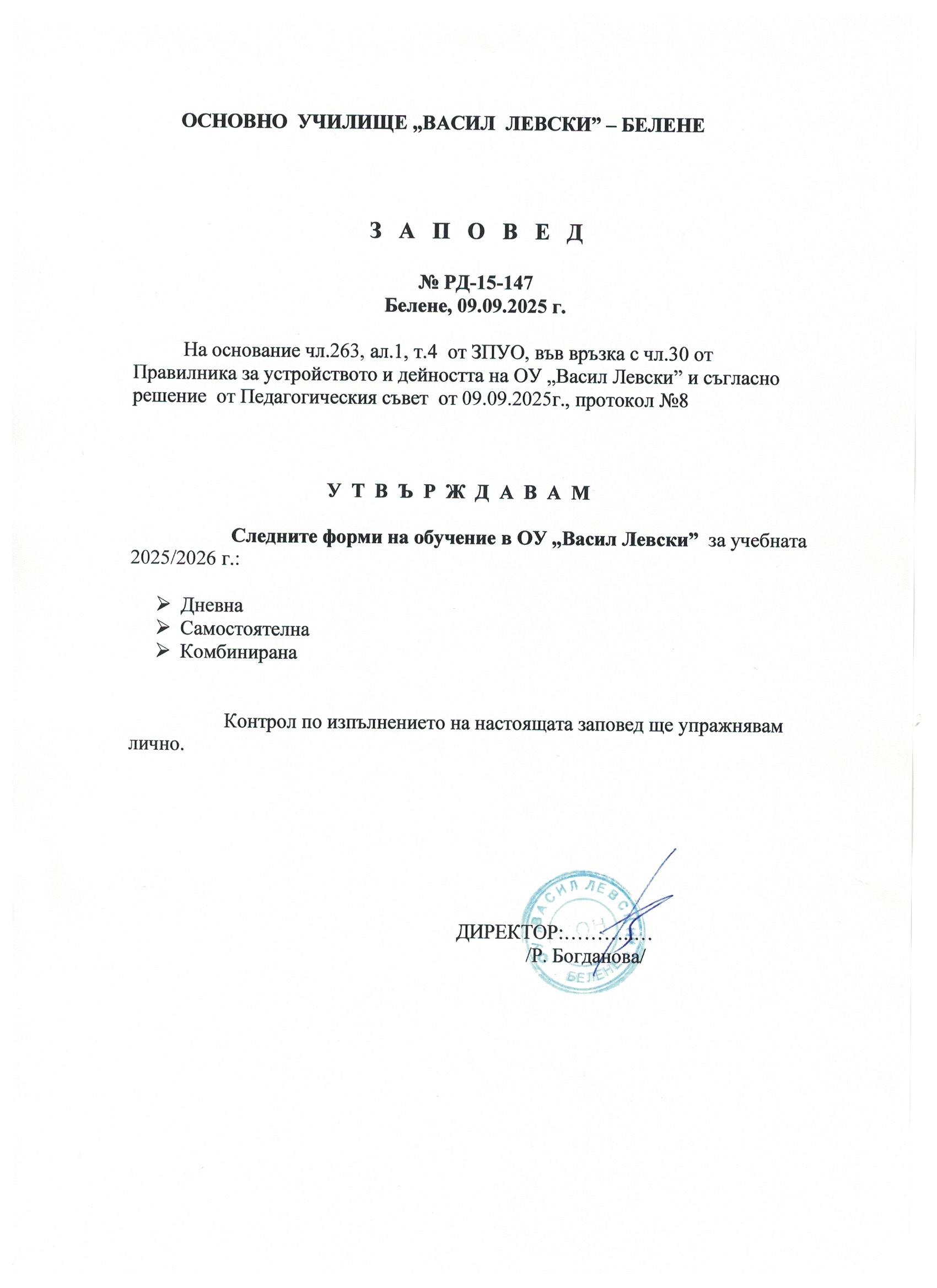 Информация за формите на обучение в ОУ „Васил Левски“ гр. Белене
