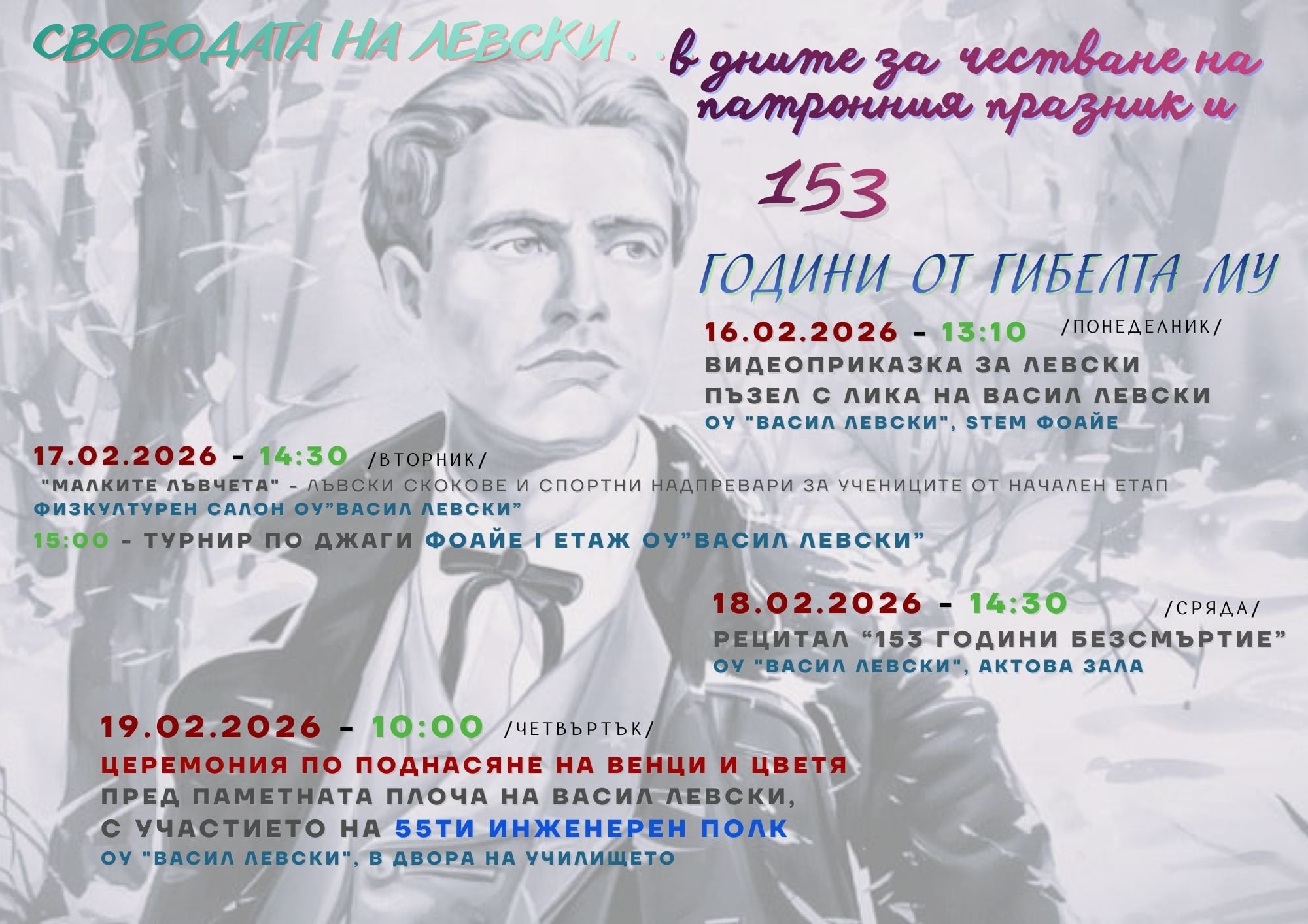 На 16 февруари в ОУ Васил Левски“ стартираха дейностите, посвенени на 153 годишнината от гибелта на Апостола. Учениците гледаха филм за живота на Левски, попълваха работни листи и наредиха пъзел с лика на Апостола. В дейностите активно се включиха и учениците от изнесена паралелка ЦСОП заедно със своите учители.