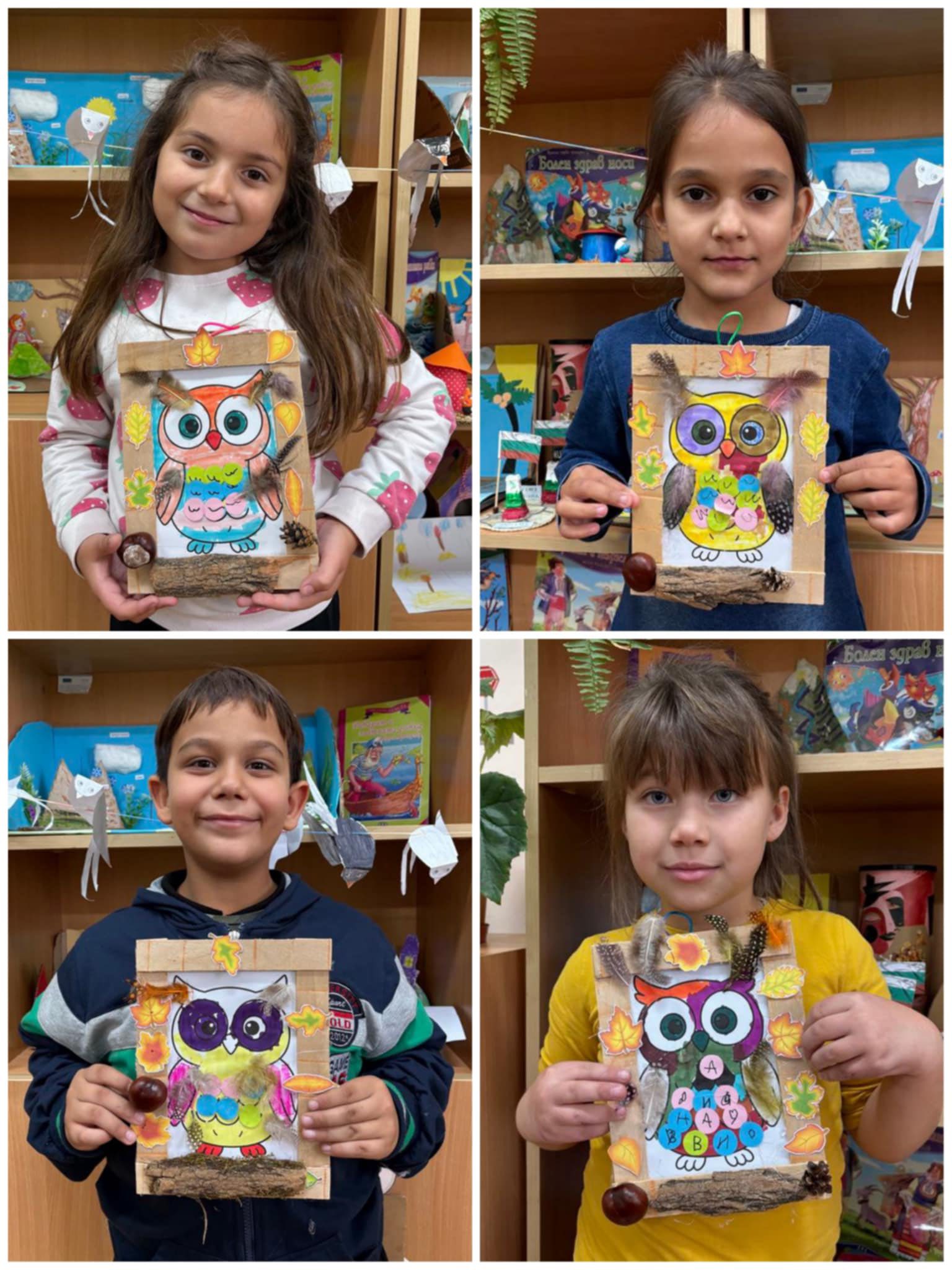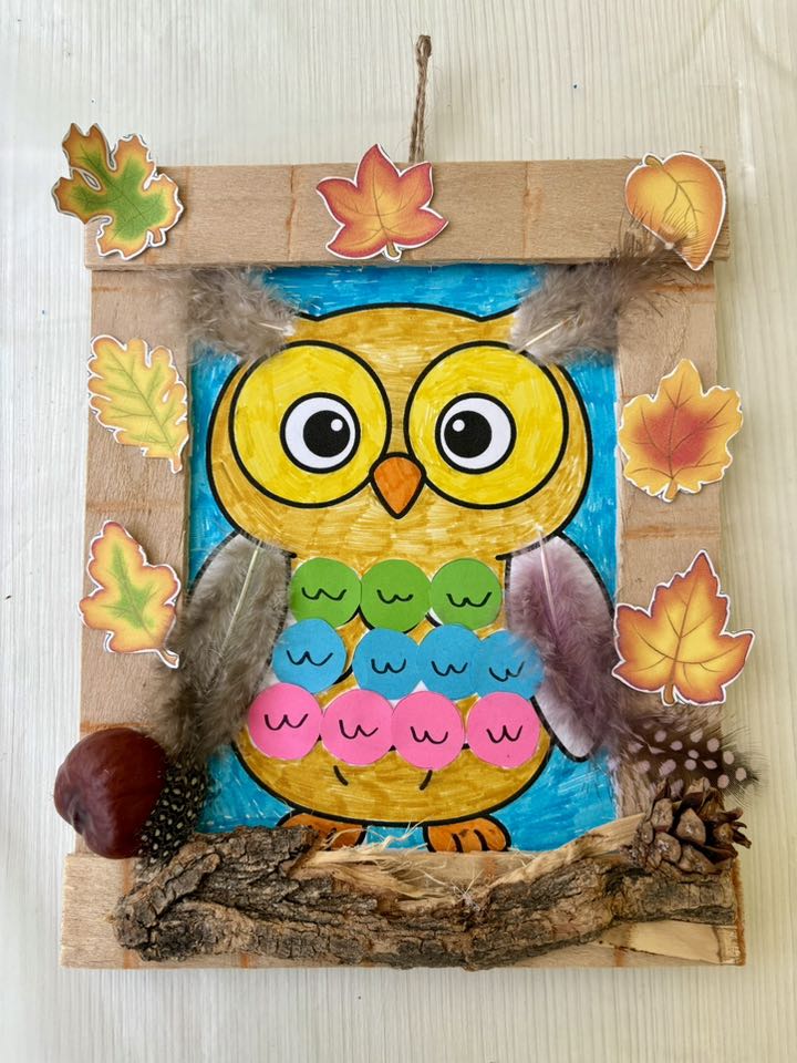 Апликация “Бухал” от цветен картон и природни материали.