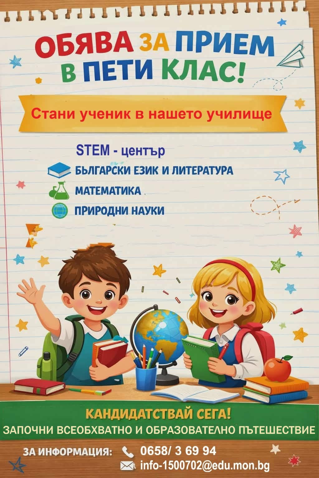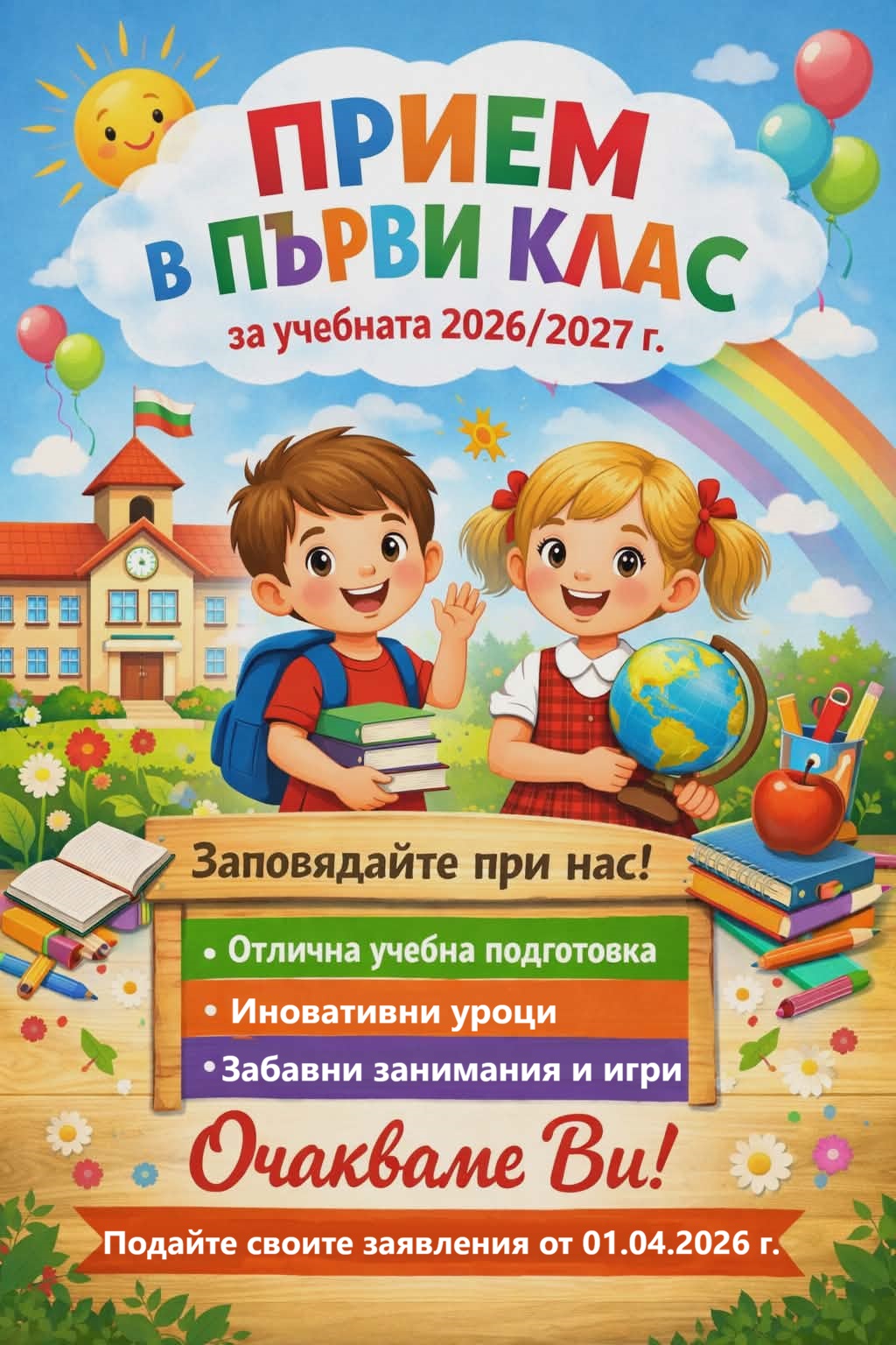 ОУ „Васил Левски“ гр. Белене започва прием на документи за записване в първи и пети клас за учебната 2026/2027 година.