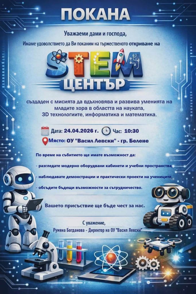 ОУ “Васил Левски“ приключи изпълнението на проект № BG-RRP-1.015-0581-C01, финансиран по Националния план за възстановяване и устойчивост, процедура за предоставяне на средства от механизма за възстановяване и устойчивост BG-RRP-1.015 – „Училищна STEM среда“. Дейностите са част от национална програма за създаване на високотехнологична среда, насочена към природни науки, математика и информатика . Нашите два кабинета са оборудвани с високотехнологични интерактивни екрани, лаптопи, 3D принтер, 3D скенер, очила за виртуална реалност, роборъка, както и електронни микроскопи, прибори, съдове и комплекти за лабораторни опити. Това позволява на учениците да работят по реални проекти и казуси, да провеждат практически експерименти, да бъдат изследователи и откриватели. Откриването на STEM центъра ще се осъществи на 24.04.2026 г. /петък/ от 10.30 ч. в сградата на училището. Отправяме покана към всички заинтересовани страни. Ще имате възможност да наблюдавате демонстрации, лабораторни експерименти и работа с апаратура, представени от учениците от 5, 6 и 7 клас. Очакваме ви!